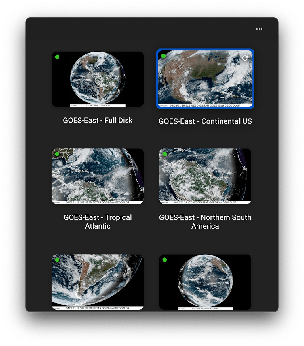 There are currently 12 views from 5 different weather satellites: Himawari-8, GOES-17 (West), GOES-16 (East), Meteosat-8, and Meteosat-11.